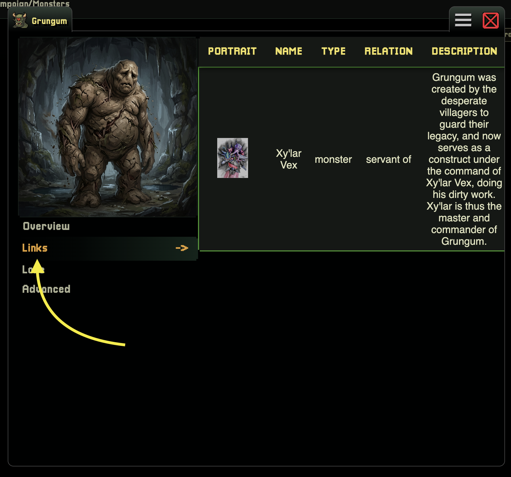 World Wizard automatically Links things together when generating Game Assets. To see these, simply click the Links option in the details modal.