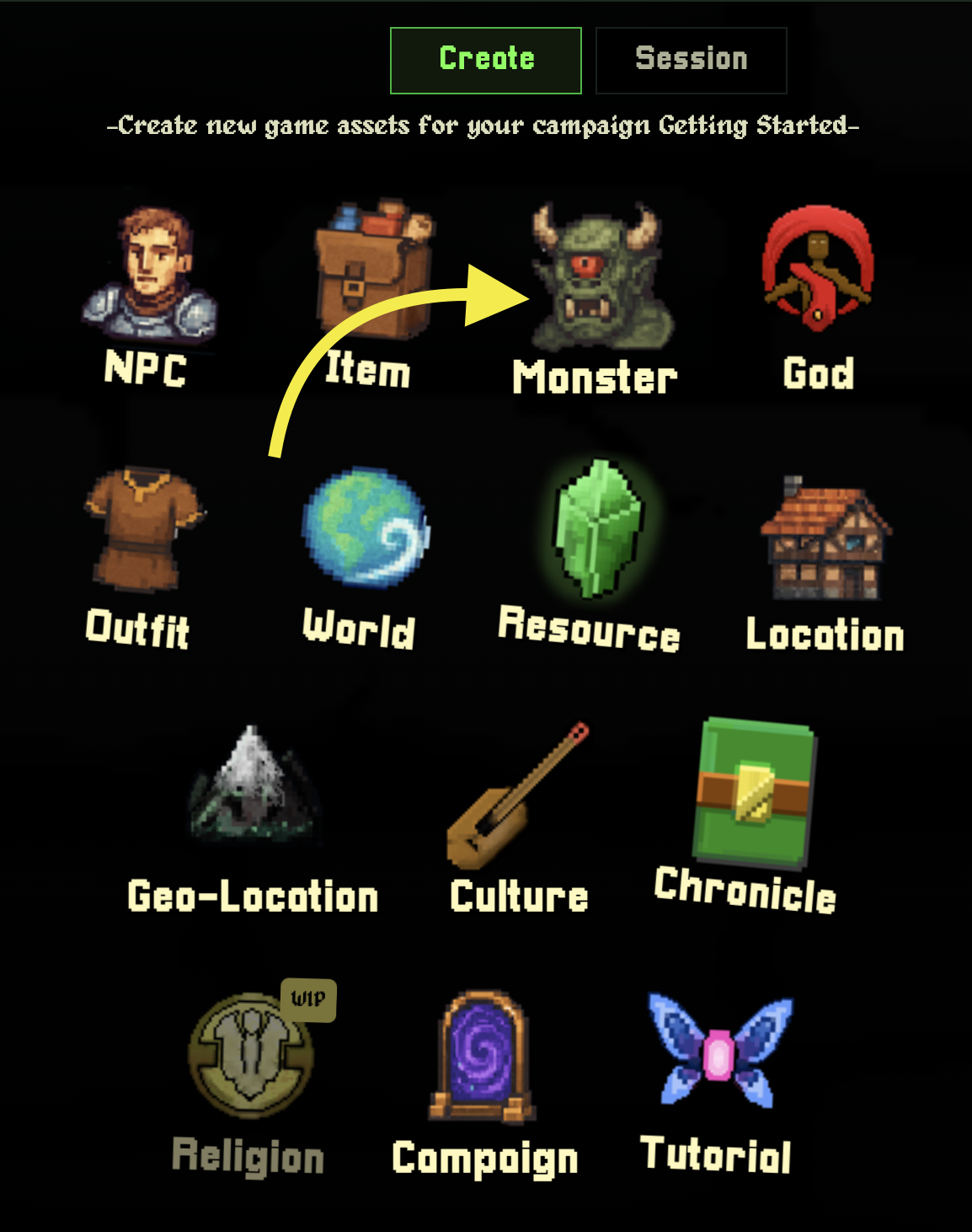 Game Assets are anything in your campaign that you players can interact with, e.g Monsters, Items, NPCs, Locations, etc...