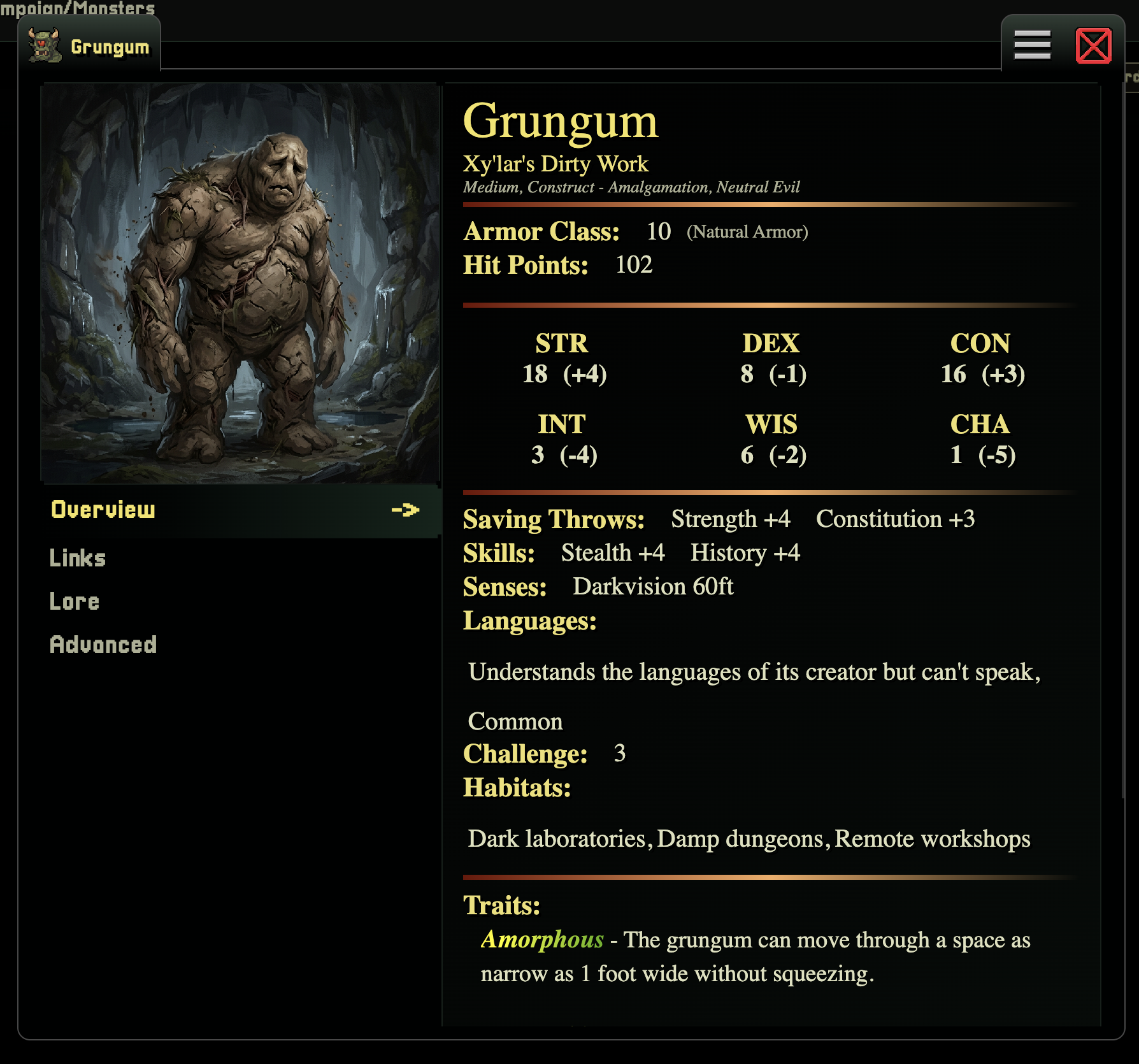 • "Grungum, an amalgomation of clay, and organic matter crafter by @Xy'lar Vex. Grungum is often used to do Xy'lar's dirty work.