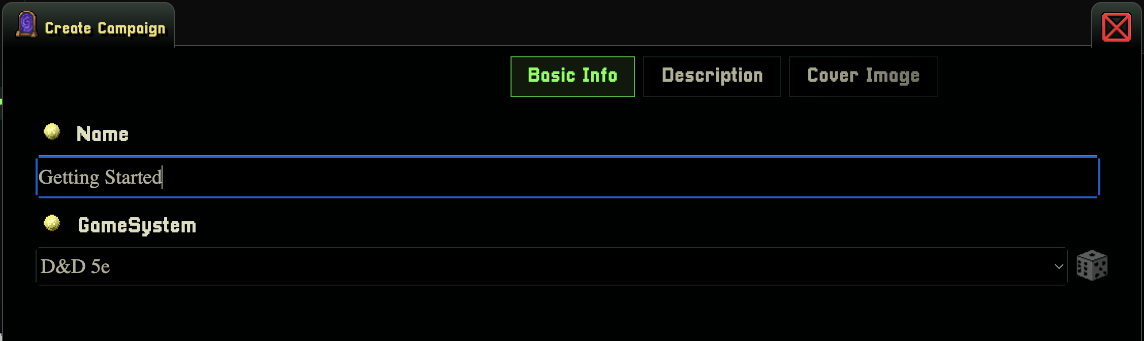 • GameSystem: DnD5e is the only game system we support right now as of v3.0.0