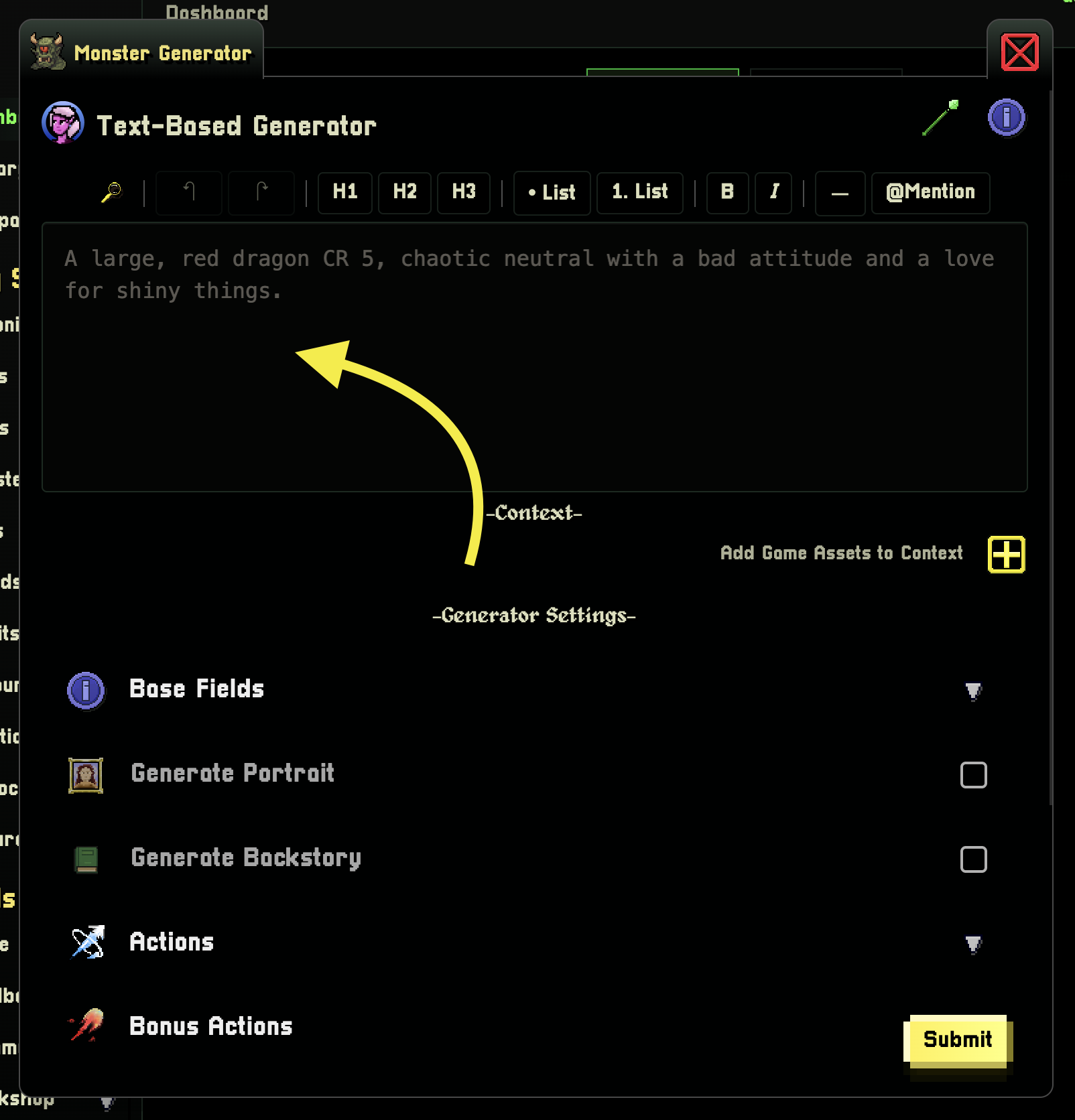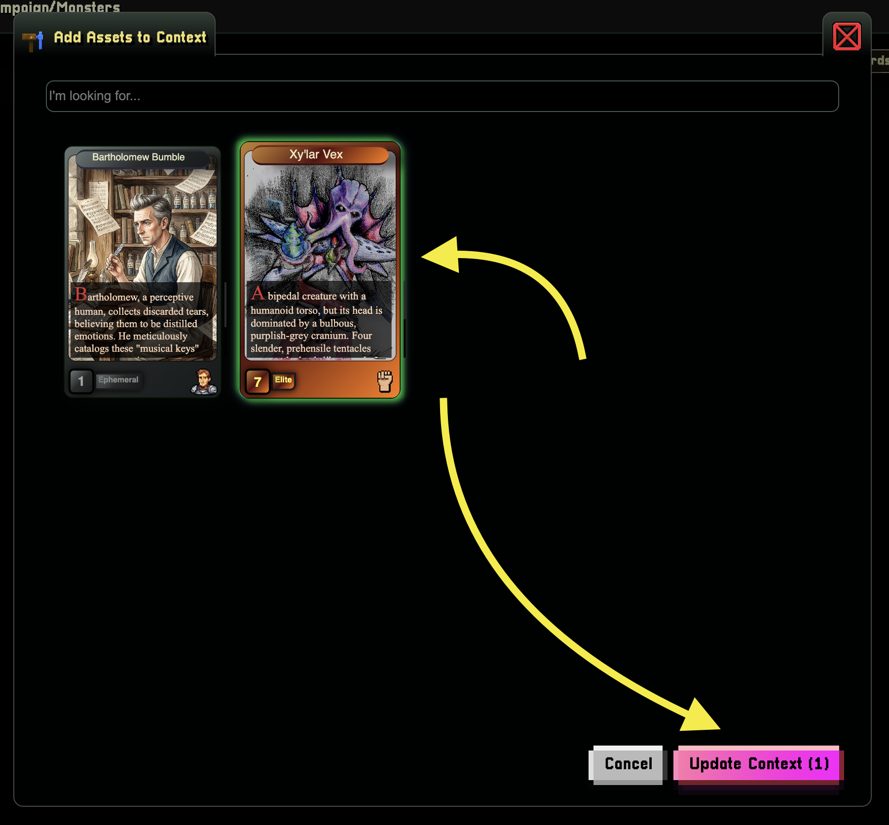 Adding Context is a great way to make your world more connected. To add context to your request is an easy as clicking the + button, selecting your game assets, and confirming.