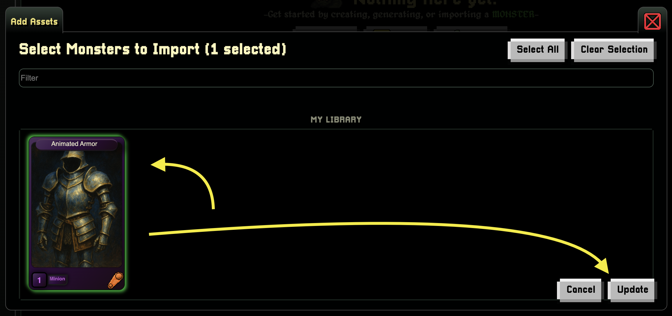 To import the monster that I just imported into my library into my campaign, I go to Get Started/Monsters/View Monsters And select import from the hamburger menu