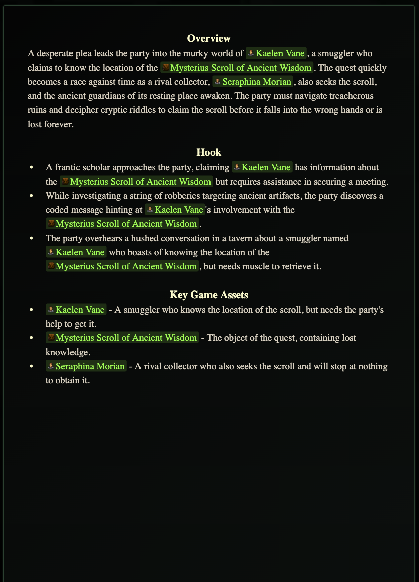 For example, if you attach an NPC named "Baron Ashford" and a location called "The Sunken Crypt", the generated quest will weave those assets into the adventure naturally.