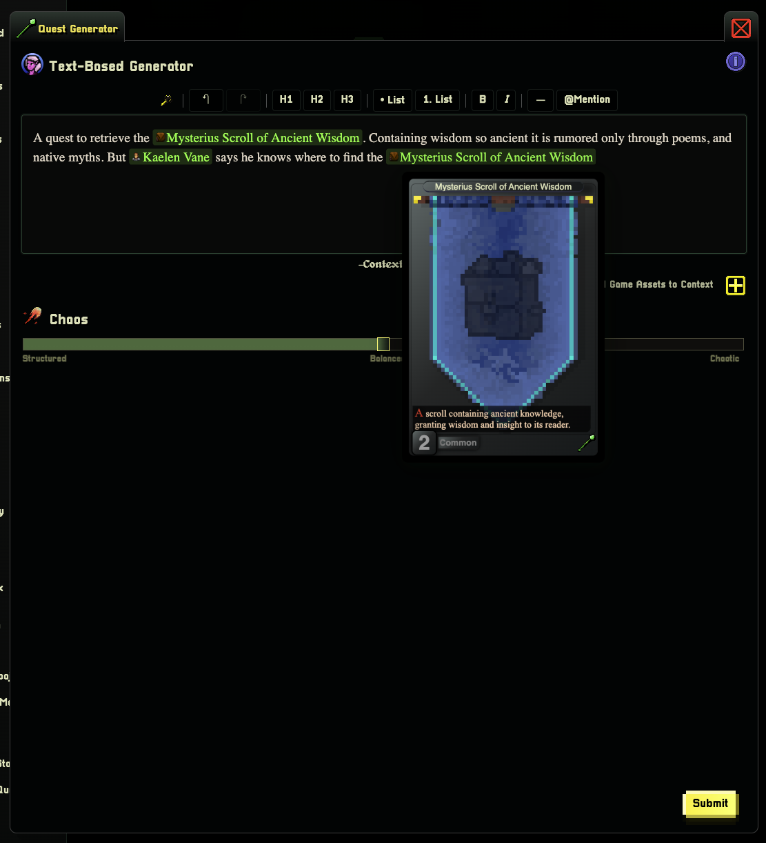 • Context — Attach existing Game Assets (NPCs, locations, items, etc.) to give the generator more to work with
